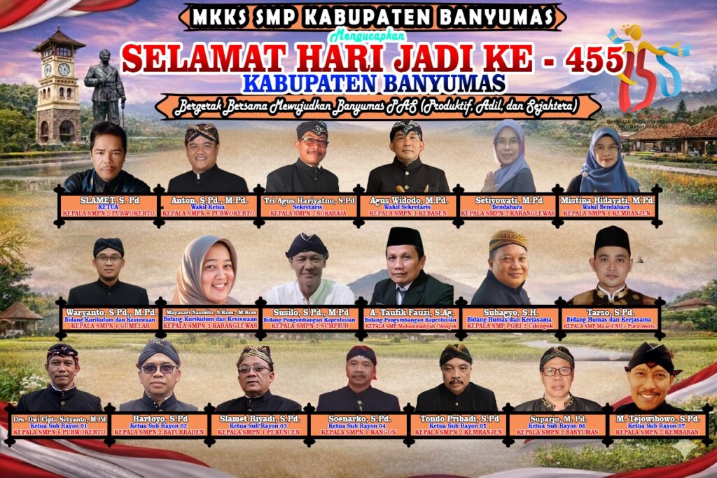 BANYUMAS – Keluarga besar Musyawarah Kerja Kepala Sekolah (MKKS) SMP Kabupaten Banyumas beserta seluruh Kepala SMP Negeri dan Swasta se-Kabupaten Banyumas mengucapkan: